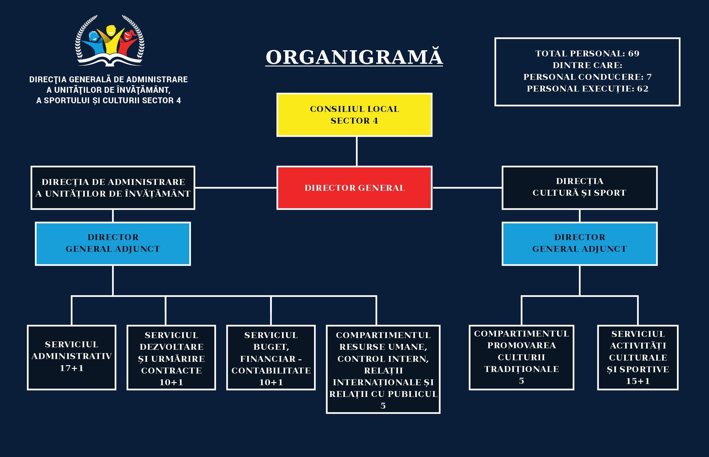 Organigrama prezintă structura organizatorică a Direcției Generale de Administrare a Unităților de Învățământ, a Sportului și Culturii Sector 4, incluzând departamentele, serviciile și relațiile ierarhice.